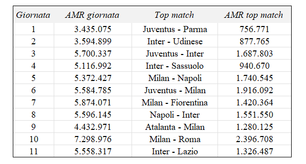 In 10 delle 11 giornate finora disputate il dato di ascolto medio complessivo supera quello della stagione passata. Infatti, escludendo gli ascolti generati dai canali satellitari Zona Dazn, in questi primi 11 turni l’AMR complessivo risulta pari a 5,2 milioni medi a giornata, in netto miglioramento rispetto ai 4,4 milioni del 2024-25. Inoltre, il dato di AMR è sceso sotto la soglia dei 5 milioni solo nel caso dei primi due turni, disputati a fine agosto, e durante il turno infrasettimanale della nona giornata. Analogamente, solo in tre giornate – la prima, la seconda e la quarta – il match più seguito non ha raggiunto il milione di AMR.