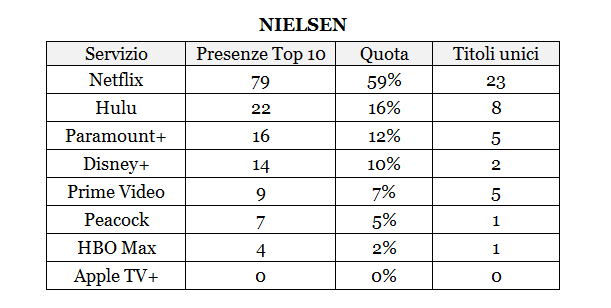 Appare invece piuttosto frammentato il resto del mercato, complici anche le differenze metodologiche tra Nielsen e Samba TV: ricordiamo, a tal proposito, che il reporting di Nielsen tende a favorire servizi come Hulu e Paramount+, che figurano spesso in Top 10 grazie a contenuti di library come Grey’s Anatomy e NCIS presenti anche su Netflix, dove tuttavia è con ogni probabilità quest’ultimo a trainare i consumi.