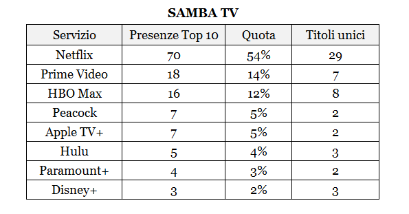 Per quel riguarda i dati forniti da Samba TV, sono complessivamente 56 i singoli titoli entrati in classifica almeno una volta nel periodo considerato: 34 serie televisive e 22 film.