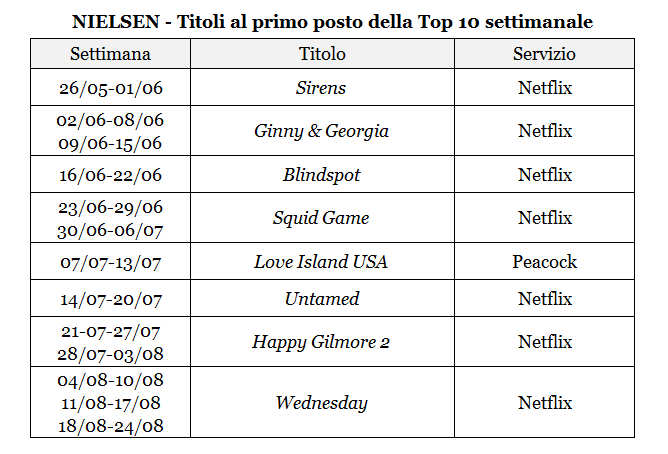 Infine, tra i titoli che hanno raggiunto per più di una volta la vetta della classifica troviamo solo contenuti Netflix. Il film Happy Gilmore 2, la serie Ginny & Georgia (3 stagioni) e l’unico prodotto non in lingua inglese incluso nell’analisi, Squid Game (3 stagioni), figurano tutti al primo posto per due settimane consecutive; Wednesday (2 stagioni), invece, si conferma un grandissimo successo imponendosi al vertice per tre settimane di seguito.