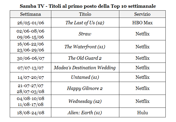Attenendoci alla metodologia di analisi impostata in due precedenti articoli usciti a giugno e a luglio, proseguiamo il nostro monitoraggio dei titoli che nel 2025 stanno maggiormente incidendo sulla crescita dello streaming nel mercato statunitense. In questo caso, ci focalizziamo sulla stagione estiva – e in particolare sulle 13 settimane comprese tra il 26 maggio e il 24 agosto – avvalendoci non solo delle classifiche generali Nielsen già utilizzate nelle precedenti pubblicazioni, ma anche delle Top 10 settimanali realizzate dal servizio Samba TV.