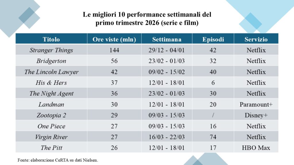 La primazia di Netflix si manifesta in modo chiaro anche considerando la vetta dei ranking, che in 12 settimane su 13 presentano al vertice un titolo fruibile sul servizio. A dominare le classifiche settimanali sono in tutti i casi serie originali Netflix (in ordine di apparizione in Top 10: Stranger Things, His & Hers, Bridgerton, The Lincoln Lawyer, The Night Agent, Virgin River, Beauty in Black), con la sola eccezione del successo cinematografico della stagione invernale Zootopia 2, disponibile su Disney+.